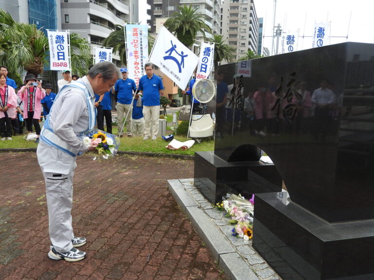 橘橋で行われたイベントでは、当組合の堂地隆一理事長が組合員を代表して、親柱に献花を行いました。橋梁に特化した塗装を生業とする当組合にとって、橋に感謝するイベントに貢献できるのはとてもありがたいことであり、今後もこうした活動を通じて、組合員の意識の向上を図り、仕事に対する誇りを高めていきます。