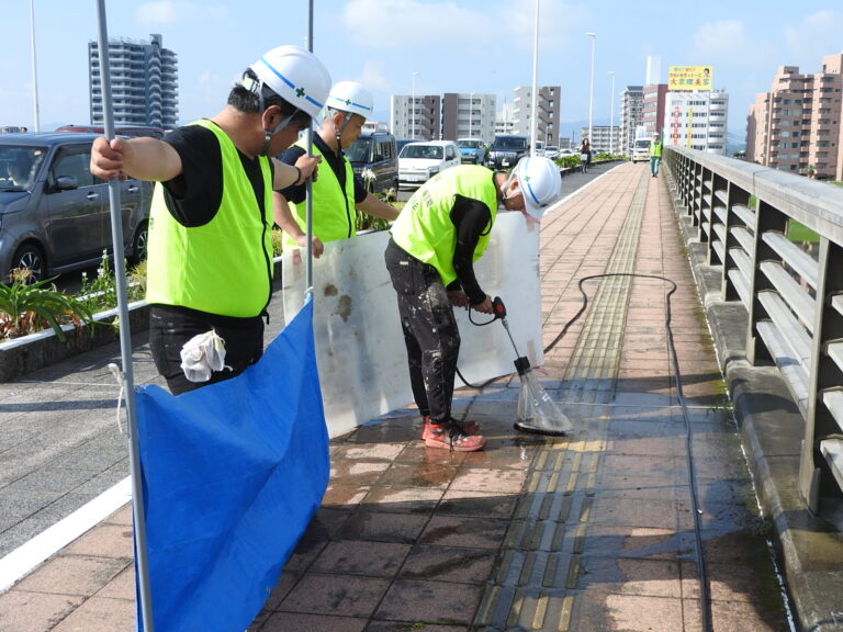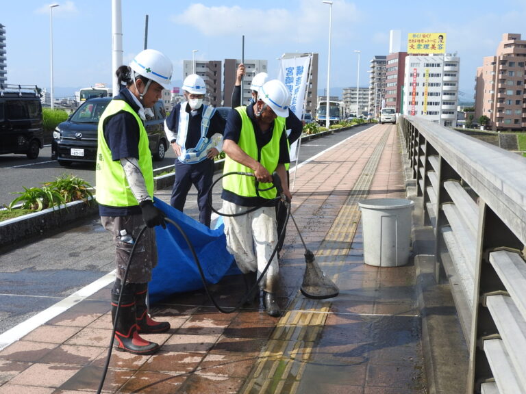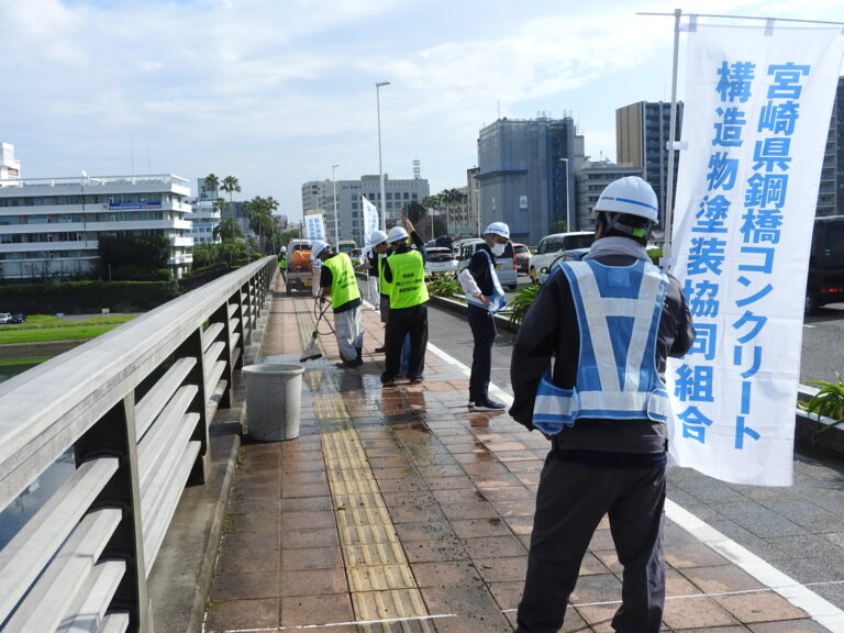 宮崎県鋼橋コンクリート構造物塗装協同組合は、8月4日に宮崎市の橘橋で行われた「橋の日」イベントで、橋梁上の点字ブロックを洗浄する奉仕活動を行いました。作業には、組合員が所属する企業から多数の職員が参加し、歩行者や自転車の往来に注意しながら、高圧洗浄機を使って汚れを綺麗に取り除きました。